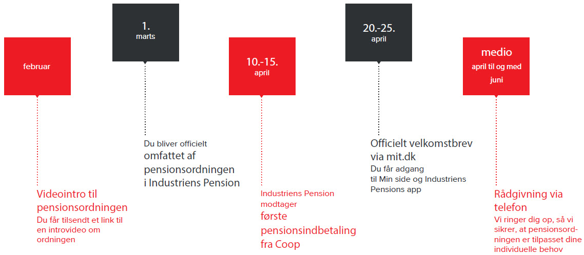 Fra 1. marts bliver du officielt omfattet af pensionsordningen hos os. I de næste par måneder vil du modtage breve fra os, når vi begynder at modtage de første pensionsindbetalinger. Til april får du adgang til Min side, vores digitale univers, samt vores app. I løbet af april og maj vil vi også kontakte dig, så vi sikrer, at pensionsordningen er tilpasset præcis til dine behov. Vi glæder os til at byde jer velkommen til Industriens Pension.